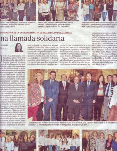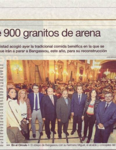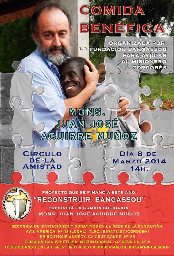 Queridos amigos, cordobesas y cordobeses fieles al proyecto de Bangassou, amigos venidos de Madrid, de Cáceres, de Sevilla, de Antequera, de Málaga, hasta de Marruecos, compañeros de ayer y de siempre que siento cerca, que nos habéis animado en tiempos de terror, a final del 2012, tiempos mezclados de “sombras pobladas de aullidos” en todo el 2013, tiempos de expolio y angustia, a todos os digo: bienvenidos a esta comida solidaria. Con esta comida y de muchas otras maneras, nos habéis apuntalado proyectos en tiempos de la invasión de los Seleka, 9 meses horribles para Bangassou y para toda Centroáfrica y en la crisis de principios del 2014 con los grupos de auto-defensa que se hacen llamar anti-Seleka, tiempos igual de nefastos porque éstos grupos no musulmanes atacan sin remordimiento a todos aquellos a los que etiquetan de “musulmanes” y matan sin sentido hombres, mujeres y niños haciendo que miles de estos musulmanes huyan del país despavoridos. Han creado una crisis humanitaria sin precedentes y han provocado que vengan a refugiarse en nuestras parroquias, juntándose con miles de no musulmanes que ya están allí refugiados… Mis curas de Bangassou, las monjas que ahora se desplazan de paquete en motos alquiladas están bien. Con tensión acumulada y desgaste, lo que algunos llaman “el cansancio de los buenos”, pero todos de pié y trabajando.